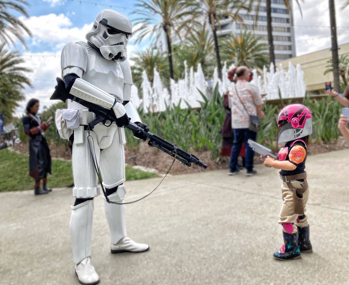 “Bye bye, Buckethead!” 💥💥 #TrooperTuesday A proud Mama-Sabine moment from @SW_Celebration. We were holding hands walking to the convention. Suddenly I felt a tug & the mini-me stopped. I looked over & #LilPuaCosplay had stopped to shoot a TK! 😆 #PewPew #MiniSabine