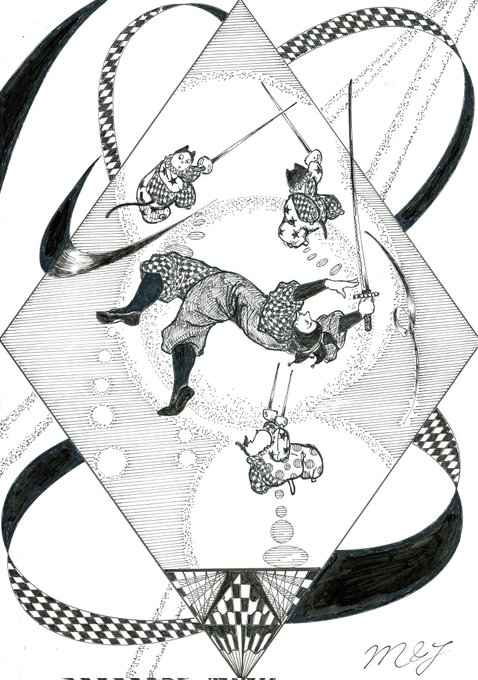 ⚔️🛡️アクションシーン🛡️⚔️ by 🎪🃏😸😺🐶《道化師と陽気な仲間たち》 #アトリエの系譜S #道化師と陽気な仲間たち #オリジナルキャラクター #アナログ #モノクローム #ペン画 #mangastyleillustration #picturebookartwork #アクションシーン #剣