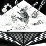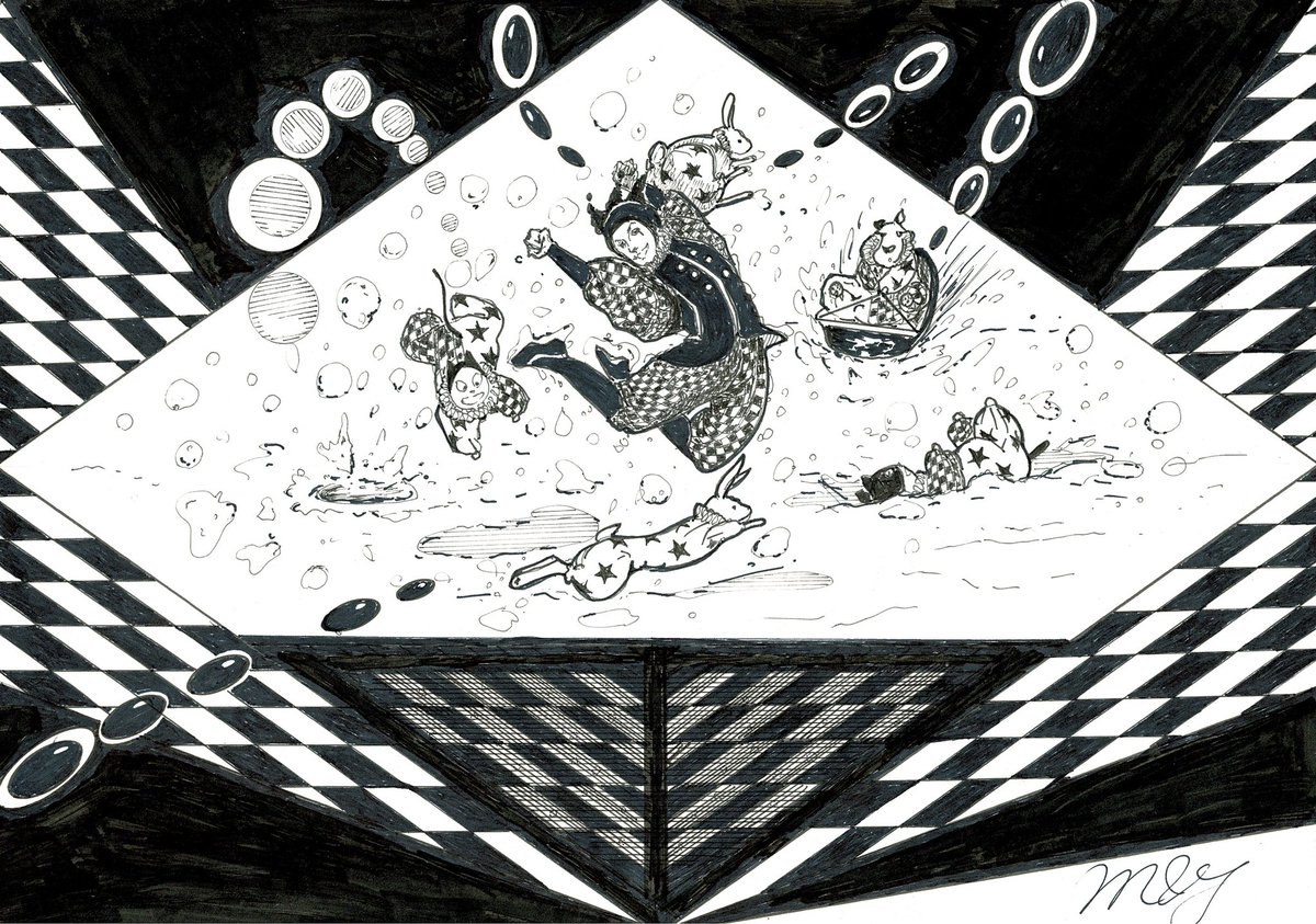 ☃️❄️🃏😸😺🐶「昨夜、雪が積もったんだ!」💞 雪の中で遊ぶ.《道化師と陽気な仲間たち》🃏😸😺🐶&🐰 #道化師と陽気な仲間たち #アトリエの系譜S #アナログ #モノクローム #挿絵 #picturebookillustration #mangastyleillustration #雪 #playing