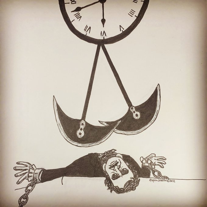 Inktober Day 14. Prompt: Tick. Art borrowed heavily from a poster for The Pit and the Pendulum. #inktober #inktober2021 #inktoberday14 #inktober2021tick #inktober2021day14 #tick #poe #halloween #drawlloween #ink #edding #drawing #sketch #art #alyssasarttherapy #resistthroughart