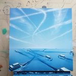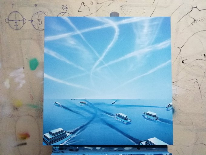 2019, acrylics on canvas, 60x60 cm #painting #pintura #peinture #fabianzolar #inktober2021 #art #malerei #blue #sea #ships #chemtrails #pollution #oil #cruiseships #mediterránea #mediterráneo #mediterranean