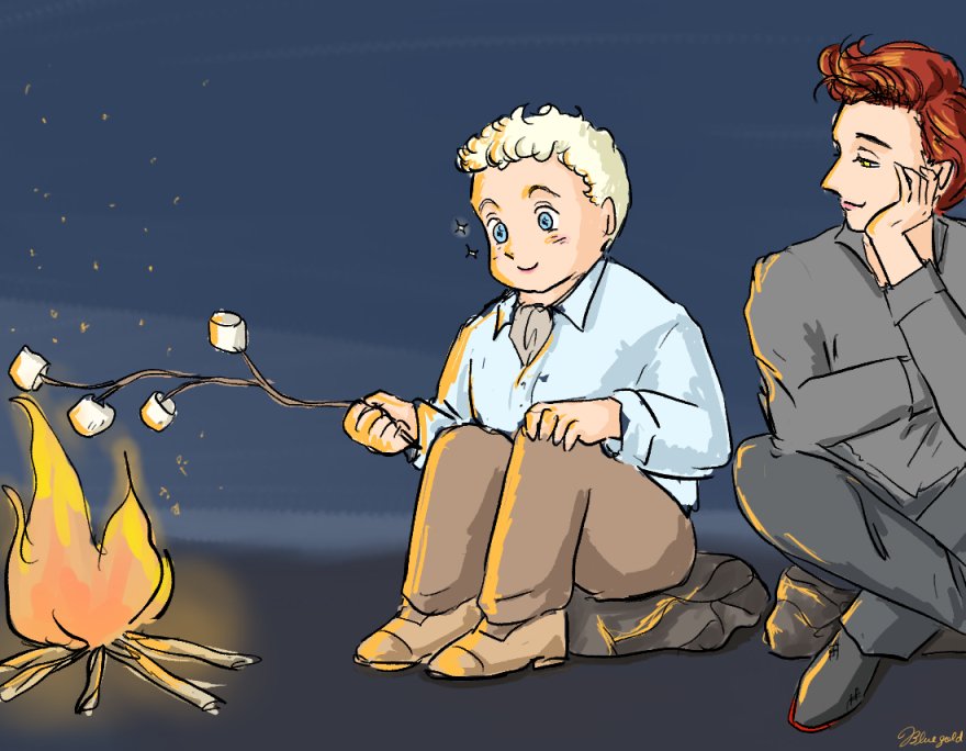 ピクニックの次はキャンプでマシュマロローストしたいアジラフェル👼 楽しそう💕 (二つ目、0時には間に合ったけど終了に間に合わなかった~) ワンドロ 食べ物とクロアジちゃん #pppラジオ #GoodOmensFanArt