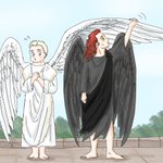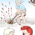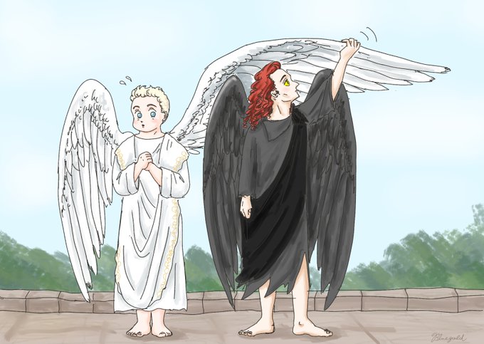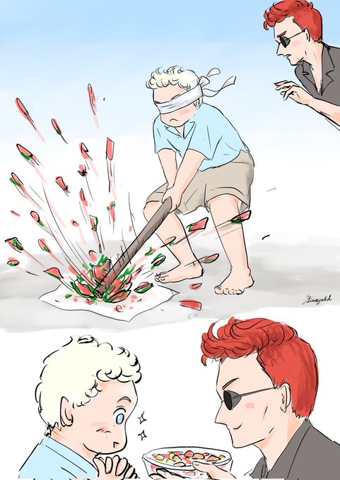 😈 アジラフェル、ちょっと力を加減したほうが…あー スイカ割りに初挑戦 粉砕したスイカはクロウリーがフルーツポンチにしてくれました 👼美味しそう🥰 ワンドロ お題 夏のクロアジ #pppラジオ #GoodOmensFanArt