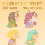 ✨ Golden Sun Enamel Pins now up for PREORDER✨ ☀️Preorders end March 18th @ 11:59pm EST ☀️Expected to ship Mid - Late April ☀️RTs are appreciated! Link to shop in replies! #GoldenSun #黄金の太陽 #EnamelPin #Preorder #OnlineStore