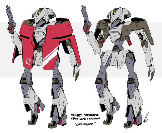 'DESPERADO' from my original mecha project 'Margrave.' A frontline Dragoon protected by a large armored shroud, the Desperado specializes in leading combined-arms attacks with the Confederacy's foot soldiers. #projectmargrave