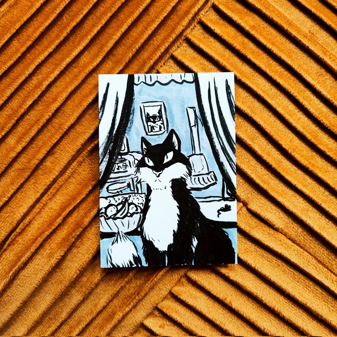 Day 16: voyeur Kitty is always watching you and judging. I'm using inktober prompts from coinswallow this year because they all sparked joy! #inktober2022 #coinswallowinktober #mask #inktober #drawtober #ATC #ACEO #artisttradingcard #drawtober2022 #prompt16 #drawingprompt