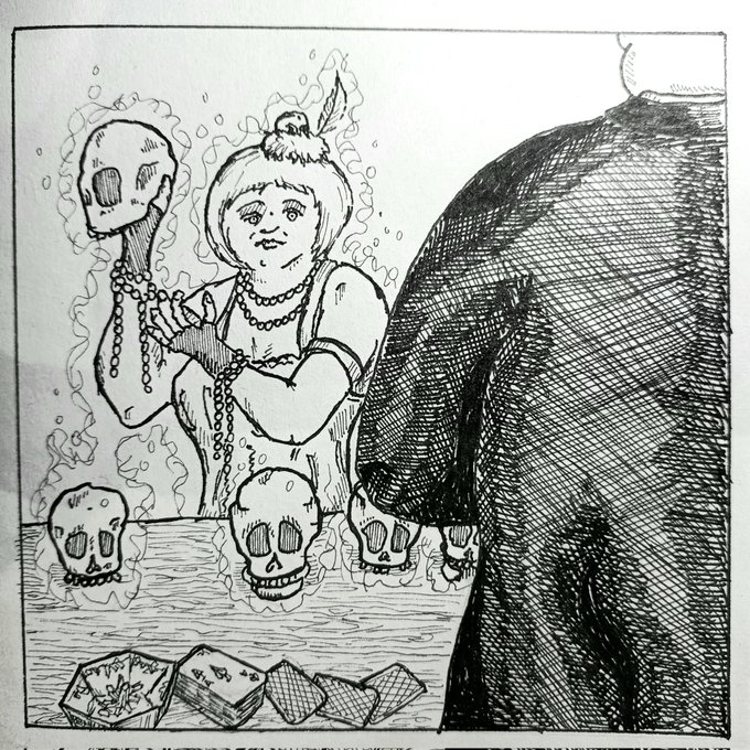 We have an #inktober #drawing today! Got it finished using today's prompt #watch and our mysterious #protagonist is watching a "sales" pitch for #skulls I hope you like it #inktober2021