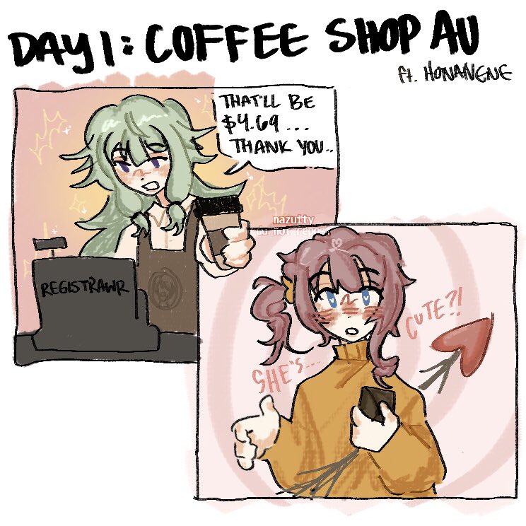 Day 1 — Coffee Shop AU IM LIKE 4-5 DAYS LATE BUT IDC I WANT AN EXCUSE TO DRAW MY RARESHIP OTP, i would die for HonaKasa Im dumb and i forgot an E in coffee too 😭 #prskrarepairweek #prsk_FA