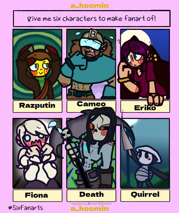 • the 6 fanarts be here! • • • • • • { #SixFanarts #psychonauts #jjba #illbleed #hauntingground #darksiders #hollowknight }