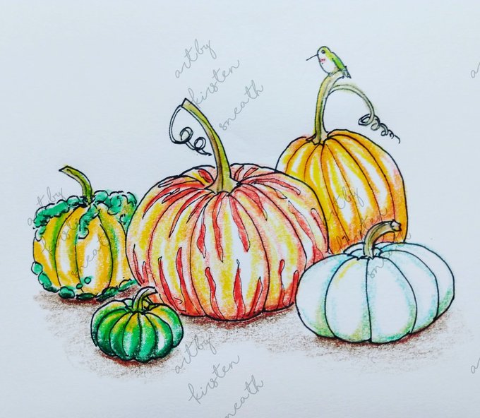Day 23 of #drawtober prompt provided by Little Island Crafts ~ Colorful ~ Inspired by our trip to the pumpkin patch today #pumpkins #colorfulpumpkins #pumpkinpatch #inktober #hummingbird #littleislandcrafts #hummingbirddrawing #inkandcolourpencil #Bainbridgeisland