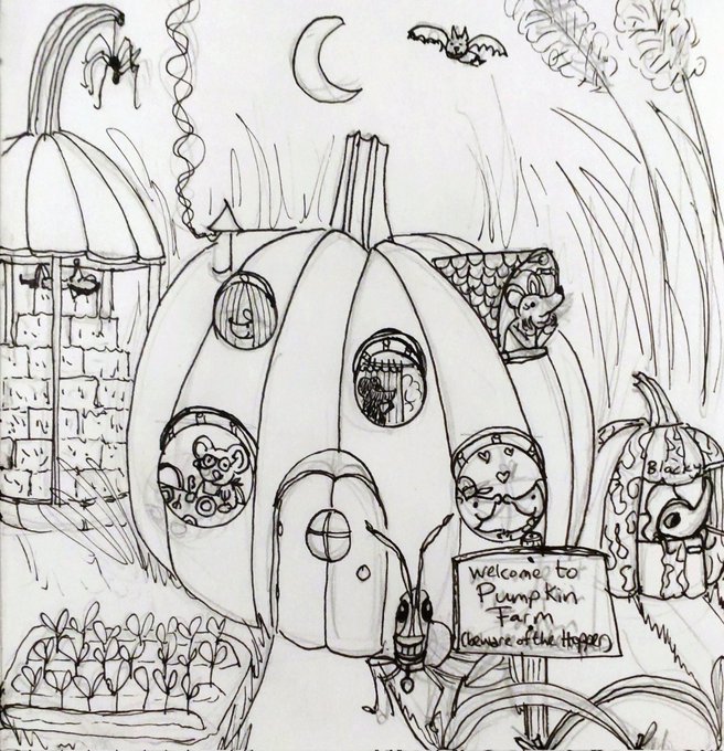 Earlier stages and a little quiz (slide 4) answers in next tweet! #drawmeanniething #woordbeeld #wordsbuildbyanne #farm #pumpkinfarm #pumpkin #mouse #mice #pumpkinpatch #happyhalloween #inktober #inktober2022 #inktober52 #inktoberfarm #inktoberallyearlong