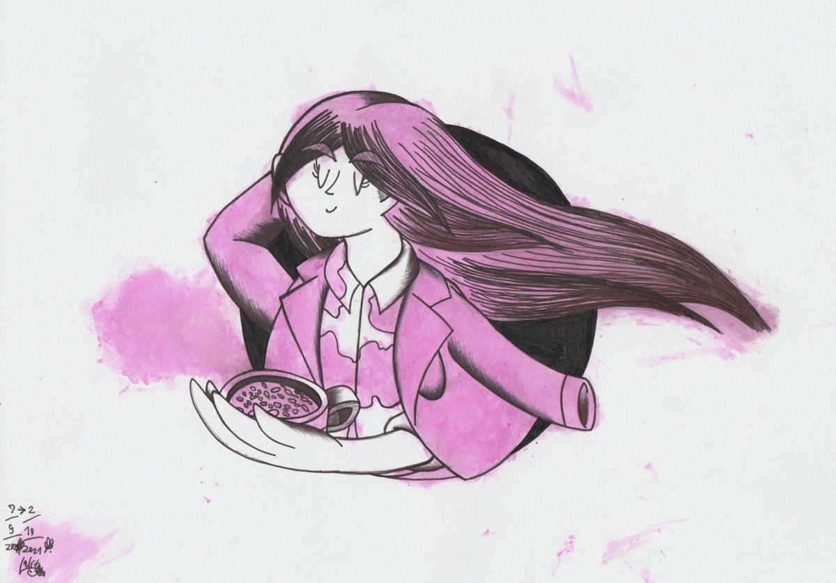 Day 2: Suit. " Dragonmilk Woman ". Technique: Pink Color from Pink Dragonfruit . #Inktober2021 #Suit #Inktober2021Day2 #dragonfruit #homemadefood #Dragonmilk #Inktober #purpleeye #drawing