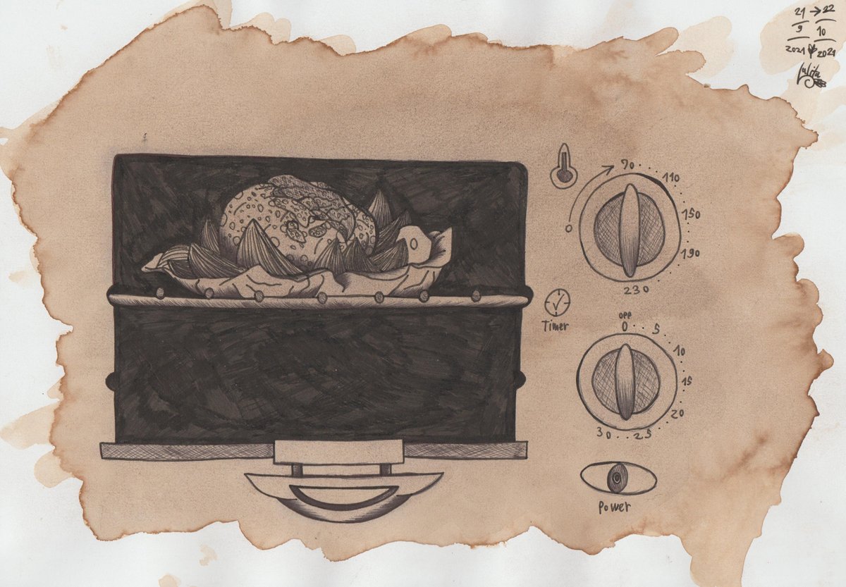Day 22: Open. " Toast Oven ". Technique: Roastbrown color. #Inktober2021 #Open #Inktober2021Day22 #BakedGarlic #Roastbrown #BakedPotato #homemadefood #Inktober #purpleeye #drawing