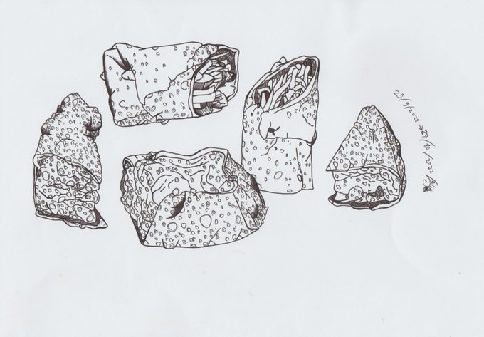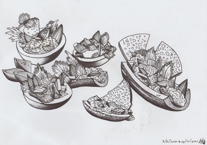 Day 28: Crispy. " Crispy Stuffeds ". Special Thanks: Nachos by Wrapgod and Tacos No.40 . #Inktober2021 #Crispy #Inktober2021Day28 #homemadefood #StuffedCucumber #StuffedTomato #BakedGarlic #Inktober #takeaway #TacosNo40 #Wrapgod #purpleeye #drawing