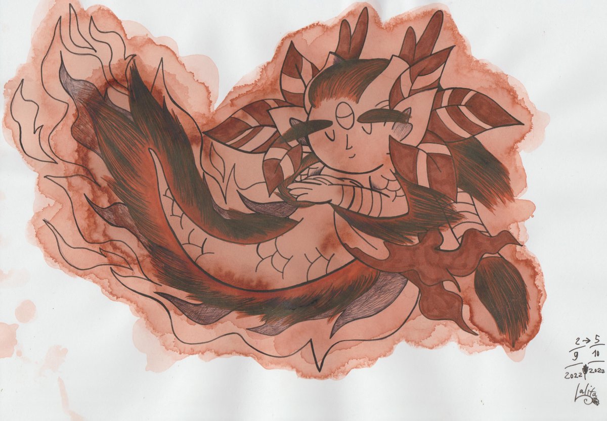 Inktober Series 2022 Day 5: Flame. " Flaming Child ". Technique : " Instant Black Tea Mixed Powder " by #Nfinite . #Inktober2022 #Flame #Inktober2022Day5 #Inktober #dragon #purpleeye #drawing