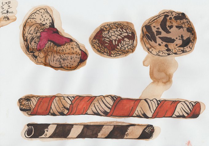 Inktober 2022 Series Day 27 : Snack. " Sweet Crispies ". Technique : Trung Nguyen Coffee Creative # 2 + Royal Myanmar Teamix . #Inktober2022 #Snack #cafehopping #Inktober2022Day27 #Roastbrown #Inktober #purpleeye #drawing