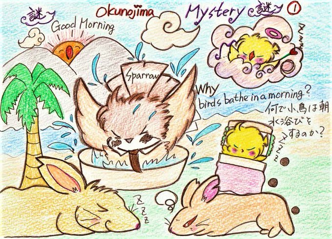 #エイプリルフール2023 #うさぎ島 #ウサギ #4コマ漫画 #Okunoisland #AprilFoolsDay #rabbitisland #大久野島 の謎 朝、大久野島の小鳥達は水浴びをしますが、なぜ? あなたも、名探偵⁉ You too a great detective? 4月1日が過ぎちゃった~🙇