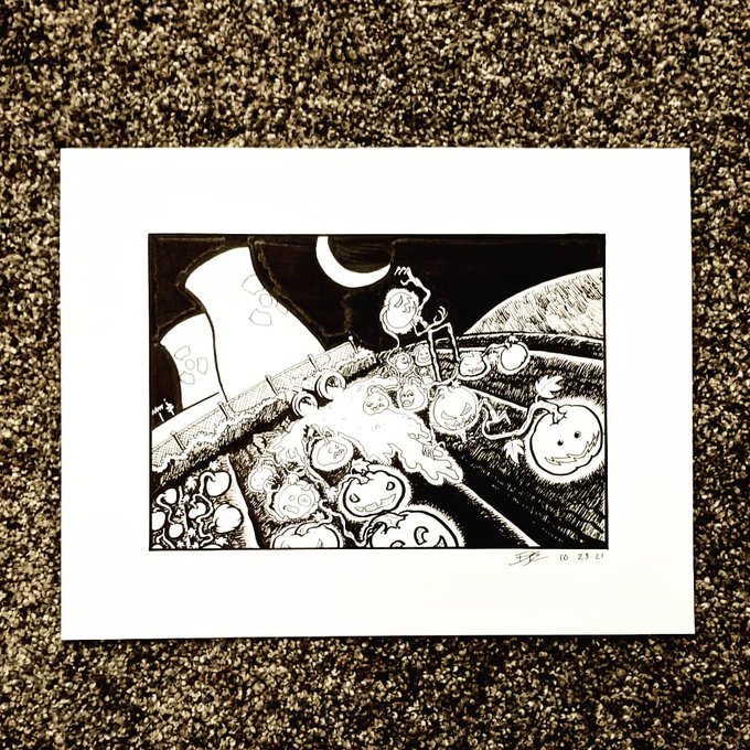 Inktober Day 23 Leak Radiation affecting the local pumpkins Do you think if they bit you, you would gain any pie or spiced latte based powers? #inktober #inktober2021 #leak #radioactive #pumpkinpatch #drawing