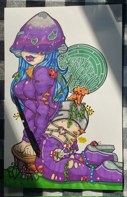 Another #mushroom pinup down! Another 11 x 17" piece completed. We will be in our house soon, so then I can get stuff done. #rainbowbrainsplatterings #originalcharacter #beibakumae #artistsontwitter #naturepinup #mushroomgirl
