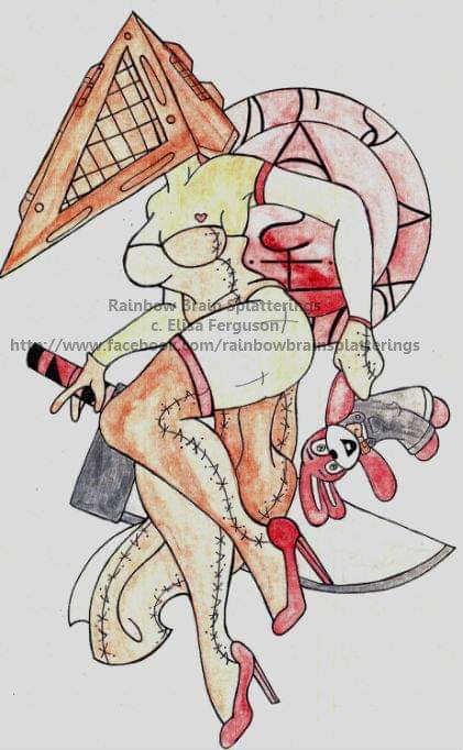 Sometimes I get a flood of creative spunk, and I do things. I'm so excited for the upcoming #SilentHill games. #pyramidhead #pinup #beibakumae #rainbowbrainsplatterings #fanart #ArtistOnTwitter #gamepinup #SilentHill2