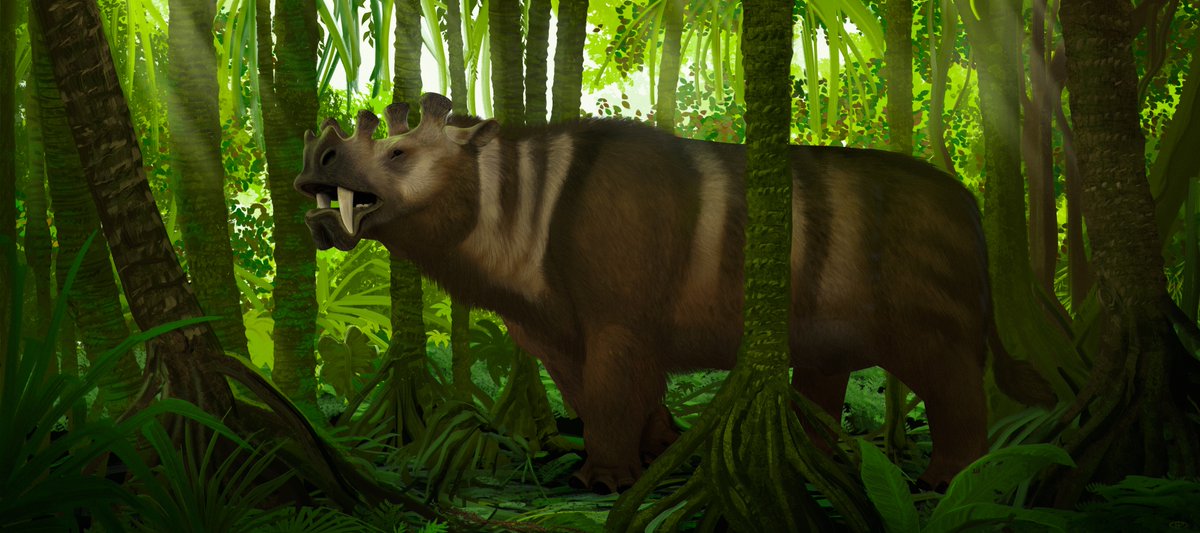 A lone male #uintatherium calls for a mate in a lush North American rainforest. #prehistoric #mammal #paleontology #paleoart #rainforest #jungle