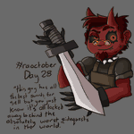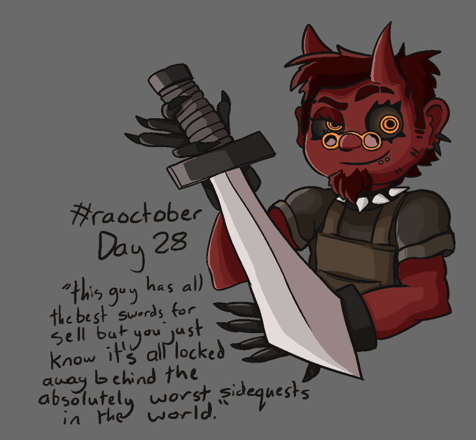 #raoctober2021 Day 28 - "this guy has all the best swords for sell but you just know it's all locked away behind the absolutely worst sidequests in the world." that title is so long i dont have room for a comment #ArtistOnTwitter #digitalart #raocow #inktober2021