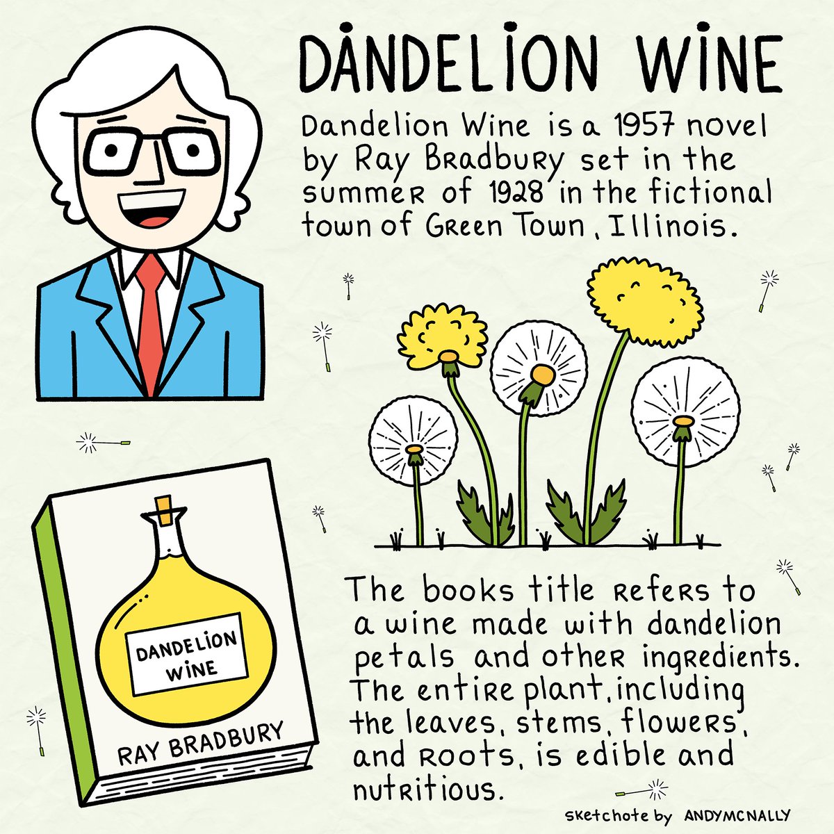 Dandelion Wine. Dandelion Wine is a 1957 novel by Ray Bradbury set in the summer of 1928. The dandelion flower petals, along with other ingredients, usually including citrus, are used to make dandelion wine. #sketchnotes #illustration #conceptsapp #dandelionwine #RayBradbury