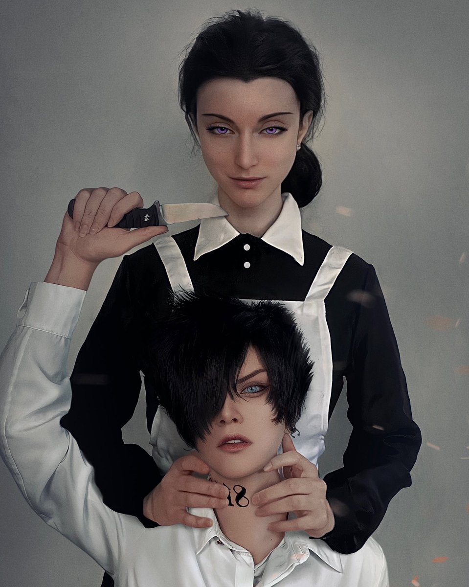 so happy that I got to work with @Pahms_cos - have y‘all seen the promised neverland?👁️👁️🤍 . #ThePromisedNeverland @DemizuPosuka #raycosplay #isabellacosplay #yakusokunoneverland #cosplayers