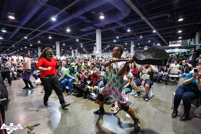 Couldn’t think of a good #cosplay for @LVLUPEXPO so i decided that I was gonna play a #Swuidgame game of Green light/Redlight… there were no survivors.. @VersusProStudio #dashade #guitarhero #wrestling #redlight #vegaswrestling #rompers #donttrythisathome