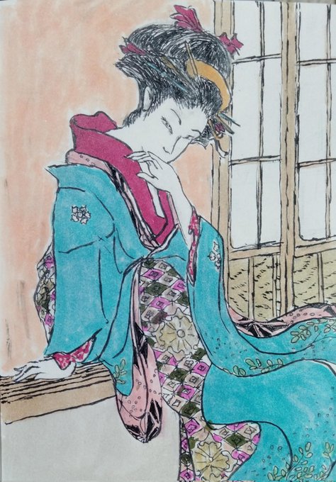 障子のそばに座る女 - Woman sitting by the Shoji door 鳥文斎栄之の浮世絵を模写。Reproduce from Ukiyoe drawn by Eishi Chobunsai.#模写 #浮世絵 #鳥文斎栄之 #美人画 #ukiyoe #reproduce #chobunsaieishi #ペン画 #penart suitenrakugaki.blogspot.com/2022/05/woman-…