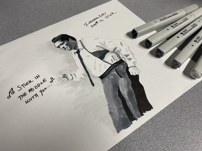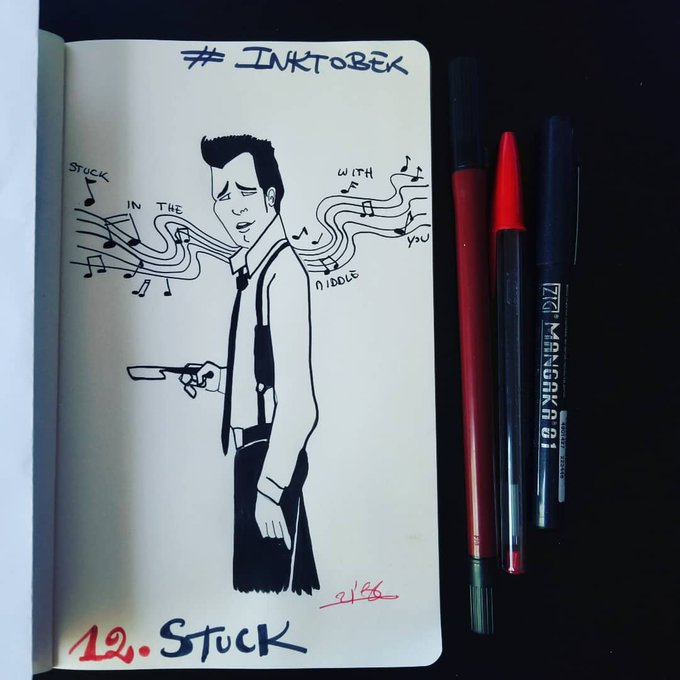 Inktober 2021 - Day 12 - Stuck 🎵“Clowns to the left of me, jokers to the right, here I am…stuck in the middle with you…”🎵 #inktober #inktober2021 #stuck #reservoirdogs #quentintarantino #mrblonde #stuckinthemiddlewithyou #stealerswheel #havesomefi… instagr.am/p/CVWVecEs5gd/