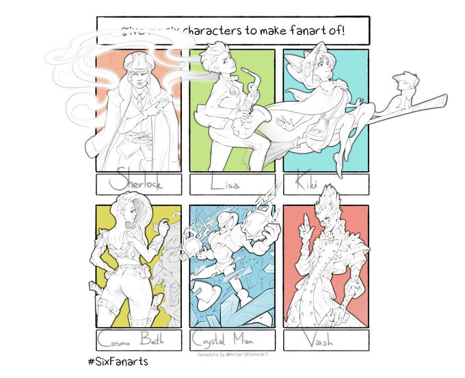 Completed #sixfanarts - Sherlock, Lisa Simpson, Kiki, Cosmo Beth, Crystal men and Vash the Stampede. Who must be colored first? #fanart #RickandMorty #animegirl #megamen