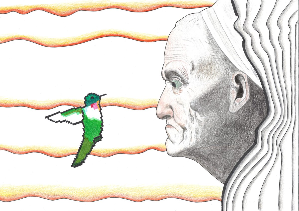 From within becomes without When the lying eight dissolves Certainty will feel like doubt When an open door revolves Search for freedom from thyself See the bird but feel the elf. #riddlebat #drawing #Artchivist #artist #hummingbird #poem #drawing @beeple @Berlin_Art_Link