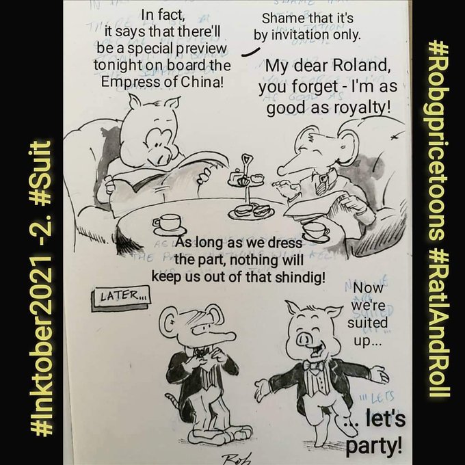 Continuing from yesterday's page for #inktober2021, we have the word #suit! Looks like the the gentlemen are out for a night on the town! Ladies, lock up your daughters! #comicstyle #comicstrip #ComicArt #sequentialart #Robgpricetoons #inksketch #Inktober #comic #cartoonstyle