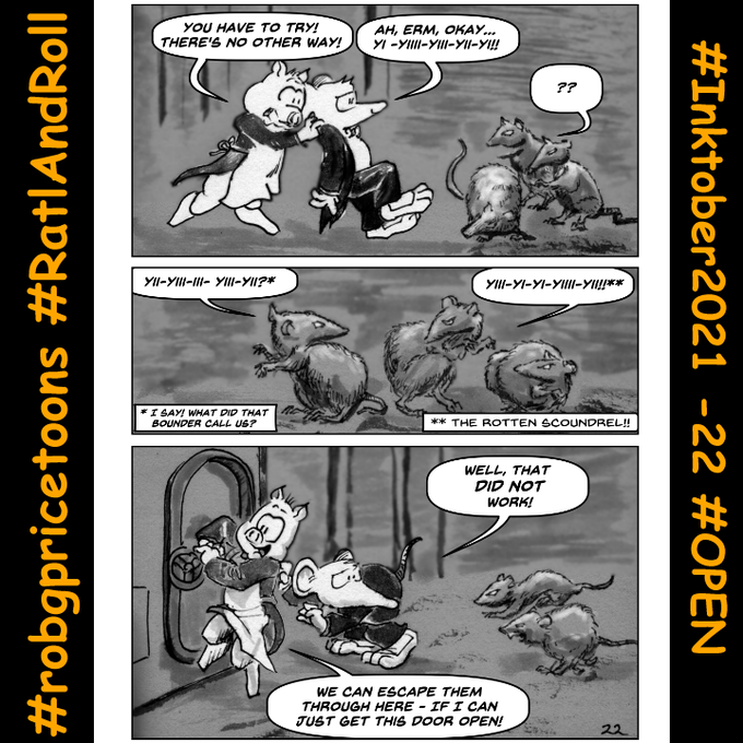 Thought I'd forgotten day 22 of #inktober2021? not a chance! Seems like Roll is 'opin' this door will #open! Stay tuned for more! #robgpricetoons #comics #comic #characterart #comicbooks #comicart #CSP #inkwash #comicbook #cartoons #webcomic #comicstrip #cartoonist #comicartist