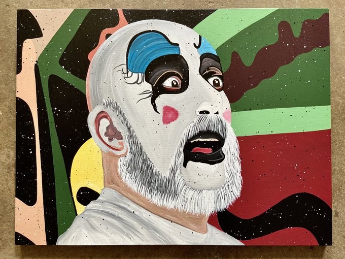 My new Captain Spaulding 2.0 painting 🤡🤡🤡 This is from the scene in House of 1000 corpses 💀 Sold‼️‼️ #artbyjangles #art #artwork #artist #cartooning #painting #drawing #inktober #halloween #sidhaig #captainspaulding #robzombie #houseof1000corpses #horror #horrorart