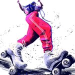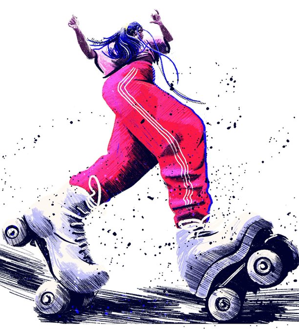 Fan art depicting Oumi Janta, a prolific roller-skating specialist, illustrated by Imogen Fancourt. The image aims to capture rhythm and dynamism using vibrant colors and exaggeration of form. Explore more: buff.ly/3Os1oI6 #oumijanta #rollerskating #portraitart #fanart