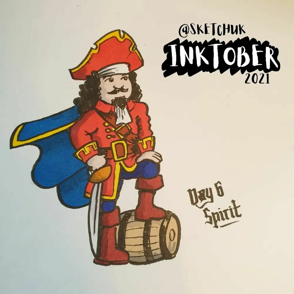 Day 6 of #Inktober2021 and the prompt is #Spirit A few of you suggested vodka related images, but my tipple of choice is #rum. My cartoonish attempt at #CaptainMorgan looks like he could do with a diet. Tomorrow's word is #Fan @inktober @jakeparker… instagr.am/p/CUsakxqKbH1/