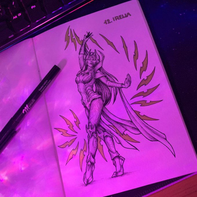 • Inktober day 12 : Irelia • Pour ce dessin j’ai fait des recherches sur les poses des danseuses, comme Irelia est très gracieuse je trouvais que ça lui allait bien 😌 ••• #irelia #lolfanart #leagueoflegends #ionia #runeterra #inktober2022 #inktoberchallenge #dailyart