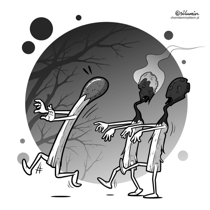 "...Biegła co sił w nogach, ale wciąż słyszała pomruki zombie za swoimi plecami. - Jeśli wyjdę z tego cało obiecuję, że odniosę książki do biblioteki! - pomyślała rozpaczliwie..." #Inktober 2022, dzień 8, match #książki #rysunek #humor #inktober2022 #inktober2022day8