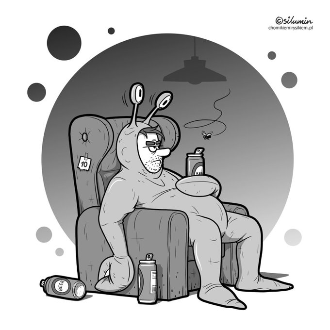 "...Od kiedy chrupki "Ultra Bekonowe" zagościły w kantynie, morale pracowników działu naukowego znacząco wzrosło, lecz morale personelu sprzątającego pognało w przeciwną stronę..." #Inktober 2021, dzień 28, crispy #humor #rysunek #inktober2021 #inktober2021day28