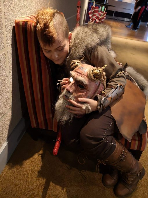 Remember to make sure your Mimir is kept cosy and comforted to ensure his best mental wellbeing 💫 its not easy being a head I'm so excited to wear this boy again in ONLY TWO WEEKS FOR THE FIRST TIME IN 2 YEARS 😍 #GodofWar #GodofWarRagnarok #atreus #cosplay #SantaMonicastudio