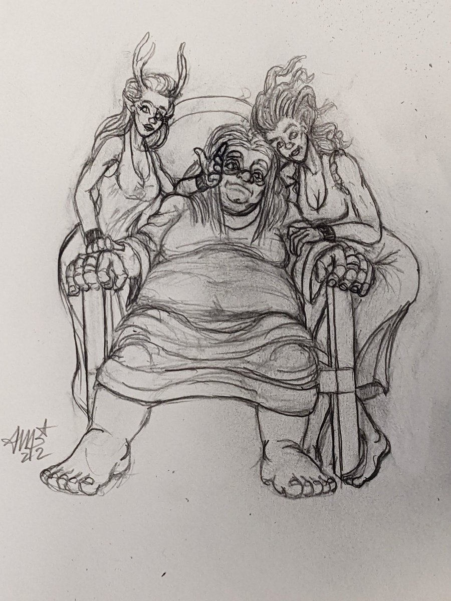 #Eladrin crimelord with two of his harem girls: ones an Air Genasi and the other an Antlerkin. #dnd #dndart #ttrpg #rpg #rpgart #savageworlds #pencilart