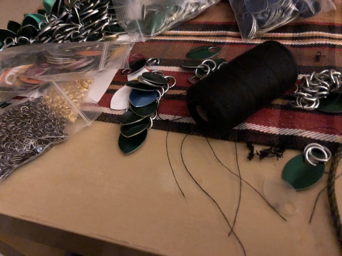 The Aftermath of tonight's #twitchstream. Made a few more keychains for the store. Rainbow, silver, and tails. #ralphbutt #gbjewelz #art #ArtistOnTwitter #artist #craftsmanship #metalwork #stream #scale #scalemail #scalemaille #dragon #dragonscales #aftermath