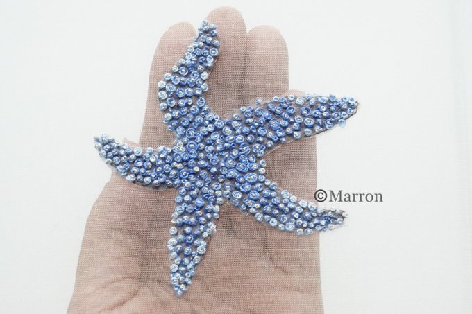 去年の個展も梅雨(7月)、その前は台風、今年も梅雨入りかなー。夏頃の個展が多いので仕方ないのですが🌊 これは北アメリカにいる巨大になるヒトデ。最大61センチだとか。Giant sea star. #scienceart #scientificillustration #embroidery #イラスト #刺繍