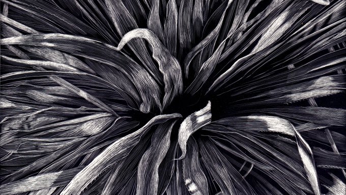 Happy Scratch-urday! I'm not doing #inktober2021 because it's too much #pressure, #inktober, 😂 but I have been working on a short series of #scratchboard drawings of plants in the asaparagus family (Asparagaceae). This one is Dasylirion wheeleri, a.k.a. "Desert Spoon."