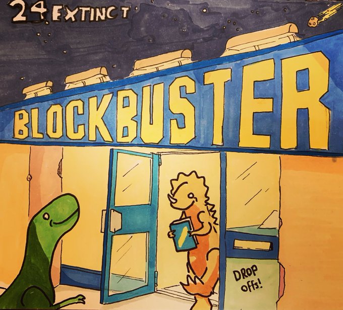 #inktober2021 #day24 and the prompt is #extinct A building wouldn’t show up in fossil records so you can’t tell me this didn’t happen. #ink #inktober #dinosaur #blockbuster #rental #meteor #drawing #doodle #scribble #promarker #scribblebrook