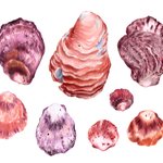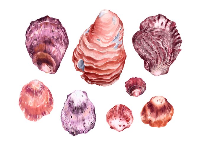 チリボタン(散り牡丹) 二枚貝で右殻と左殻のデザインが全然ちがいます。 上段中央のフリル状が右殻、それ以外のトゲトゲが左殻(たぶん)。右殻はあまり見かけない。 ちなみに全部本当にチリボタンなのかは怪しいところ。 #illustration #イラスト #seashells #beachcombing