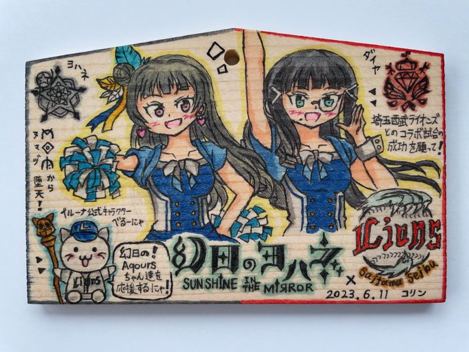 6/11.埼玉西武ライオンズ×幻日のヨハネコラボ試合がベルーナドームにて開催されるので、ライオンズ応援団のヨハネ.ダイヤを神田明神の絵馬に描きました。 公式キャラ.べるーにゃを合わせて。コラボ試合の成功を願って!(・∀・) #lovelive #yohane #seibulions (@lions_official)