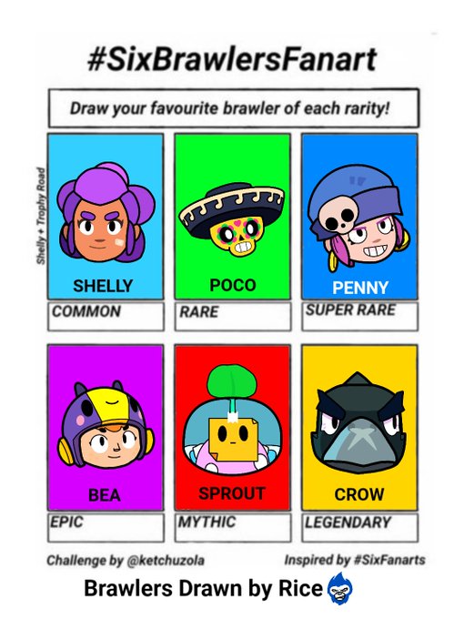 I drew my favorite Brawlers of each Rarity!! @KetchuZola #sixbrawlersfanart #sixfanarts #brawlstars #brawlart #brawlstarsfanart #shelly #poco #penny #crow #sprout #bea
